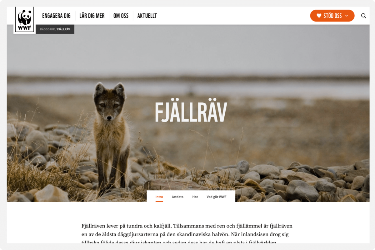 Bevara världens biologiska mångfald. Verka för att förnybara naturresurser används på ett hållbart sätt. Minska föroreningar och ohållbar konsumtion. Det är inga små ämnen vår kund Världsnaturfonden i Sverige arbetar med. Därför blev det extra viktigt att skapa en webb som erbjöd en användarvänlig och tillgänglighetsanpassad upplevelse med rum för alla hjärtefrågor. En plats där insamling och utbildningsmaterial kunde samsas med hållbara semestertips och aktuella nyheter. En plats som gjorde rättvisa av WWFs arbete för en levande planet.
